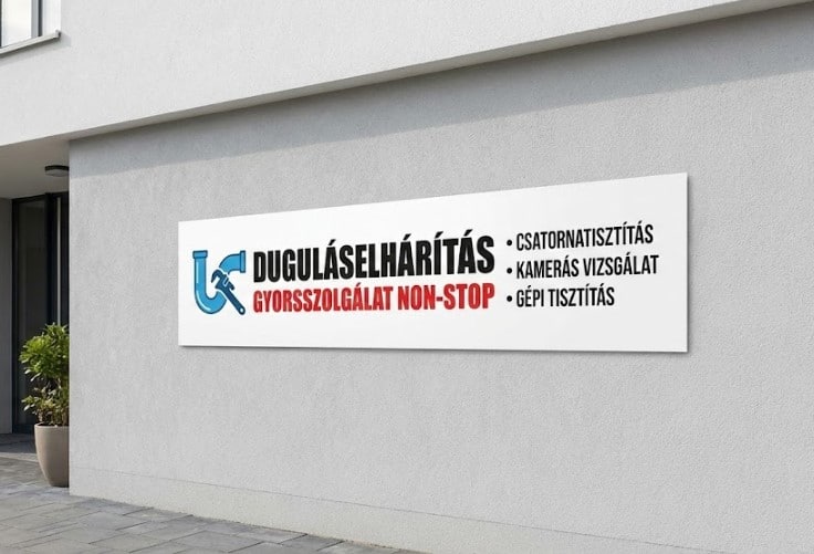 Tegye azonnal láthatóvá szolgáltatását egyedi feliratos, időjárásálló kültéri duguláselhárítás reklámtábla segítségével! Ez a 130×50 cm-es professzionális gyorsszolgálati üzletdekoráció garantálja, hogy a bajba jutott ügyfelek már messziről megtalálják az ön elérhetőségét.