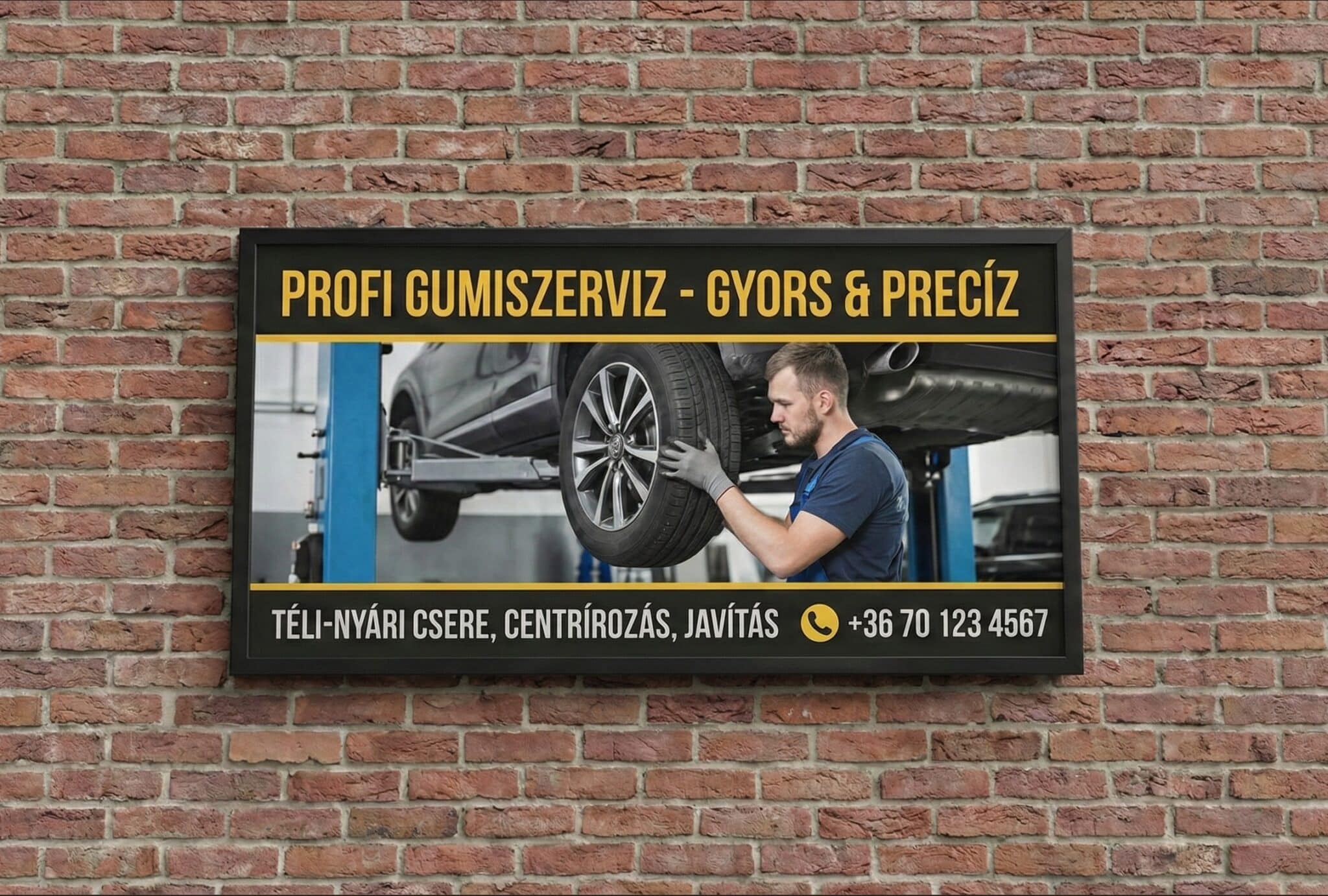 Ez a 130×50 cm-es egyedi grafikás műhely tábla kifejezetten a gumiszervizek igényeire lett szabva. A mérete pont ideális ahhoz, hogy a főút mellett elhaladó autósok is időben észrevegyék a szolgáltatásait, legyen szó szezonális gumicseréről vagy gyorsszervizről. 🏎️💨