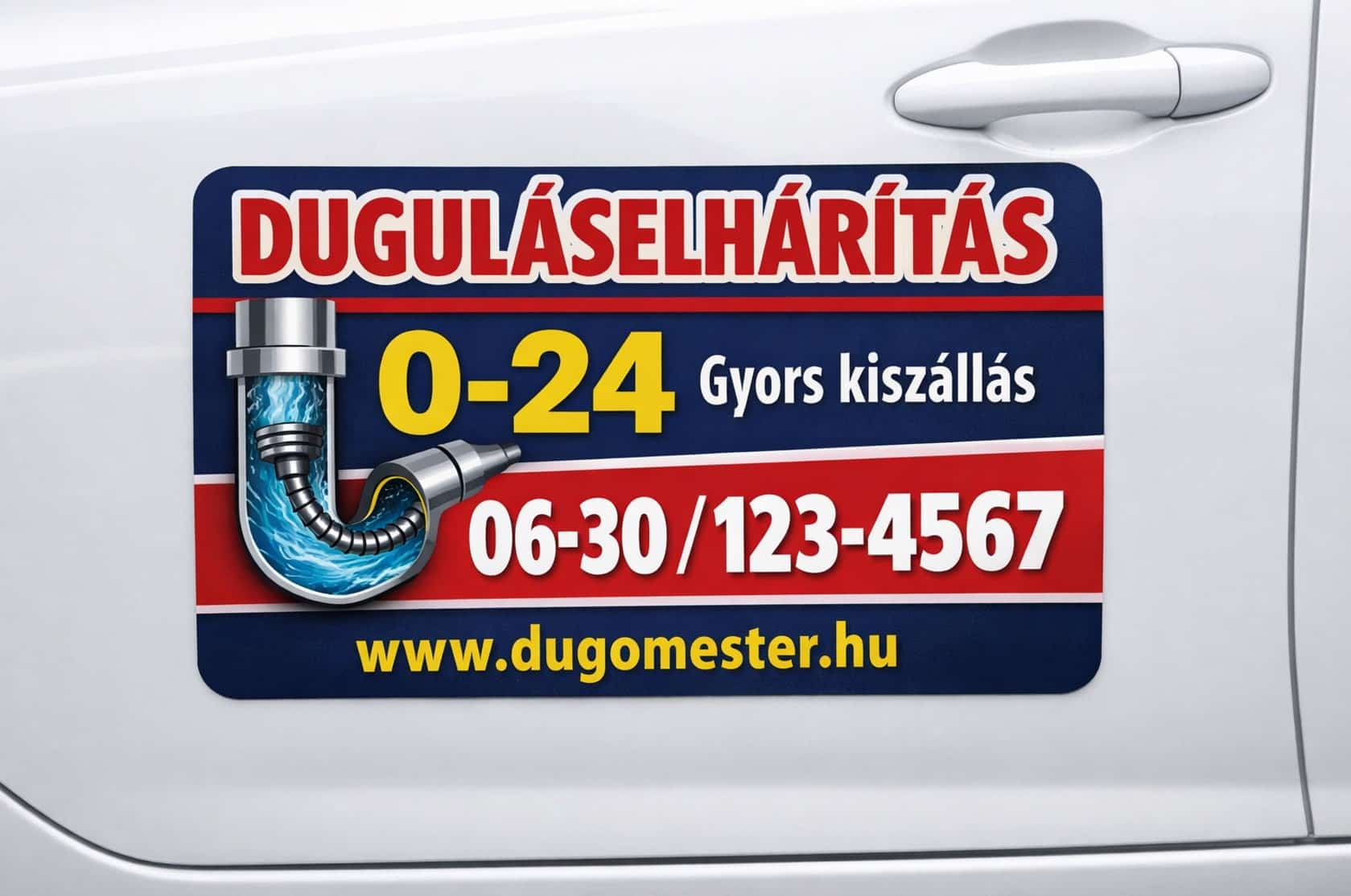 Figyelemfelkeltő duguláselhárító autómágnes 60×30 cm méretben, jól olvasható felirattal és hangsúlyos telefonszámmal.