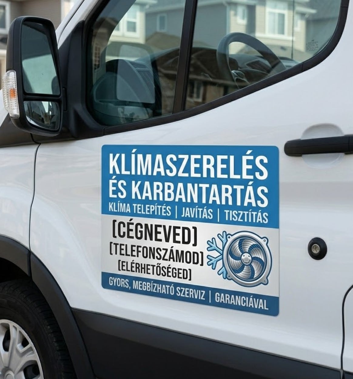 A klímaszezonban a gyorsaság és a megbízhatóság mindennél többet ér. Ezzel a sablon autómágnes megoldással nem kell heteket várnod a grafikai tervezésre. A dizájnt úgy alakítottuk ki, hogy a hűtés-fűtés technológiához passzoló színek és ikonok azonnal bizalmat ébresszenek a potenciális ügyfelekben, legyen szó telepítésről, javításról vagy tisztításról.