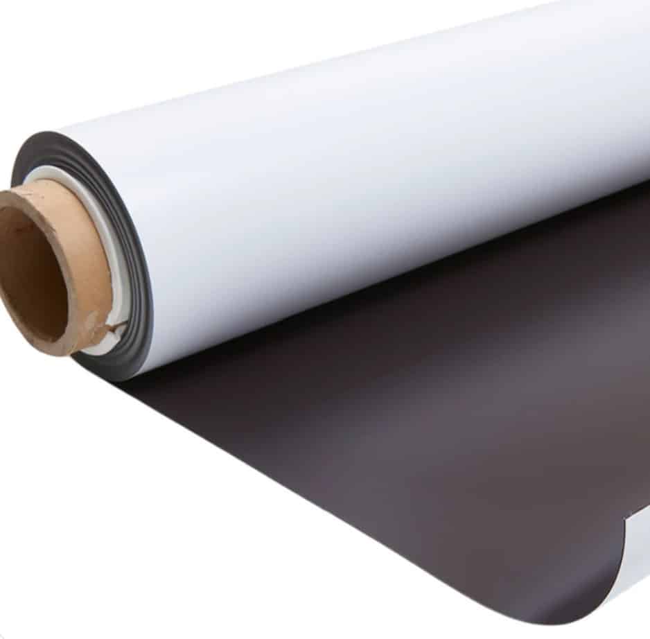 Ipari erejű, 0,85 mm vastagságú mágnesfólia matt fehér PVC bevonattal.