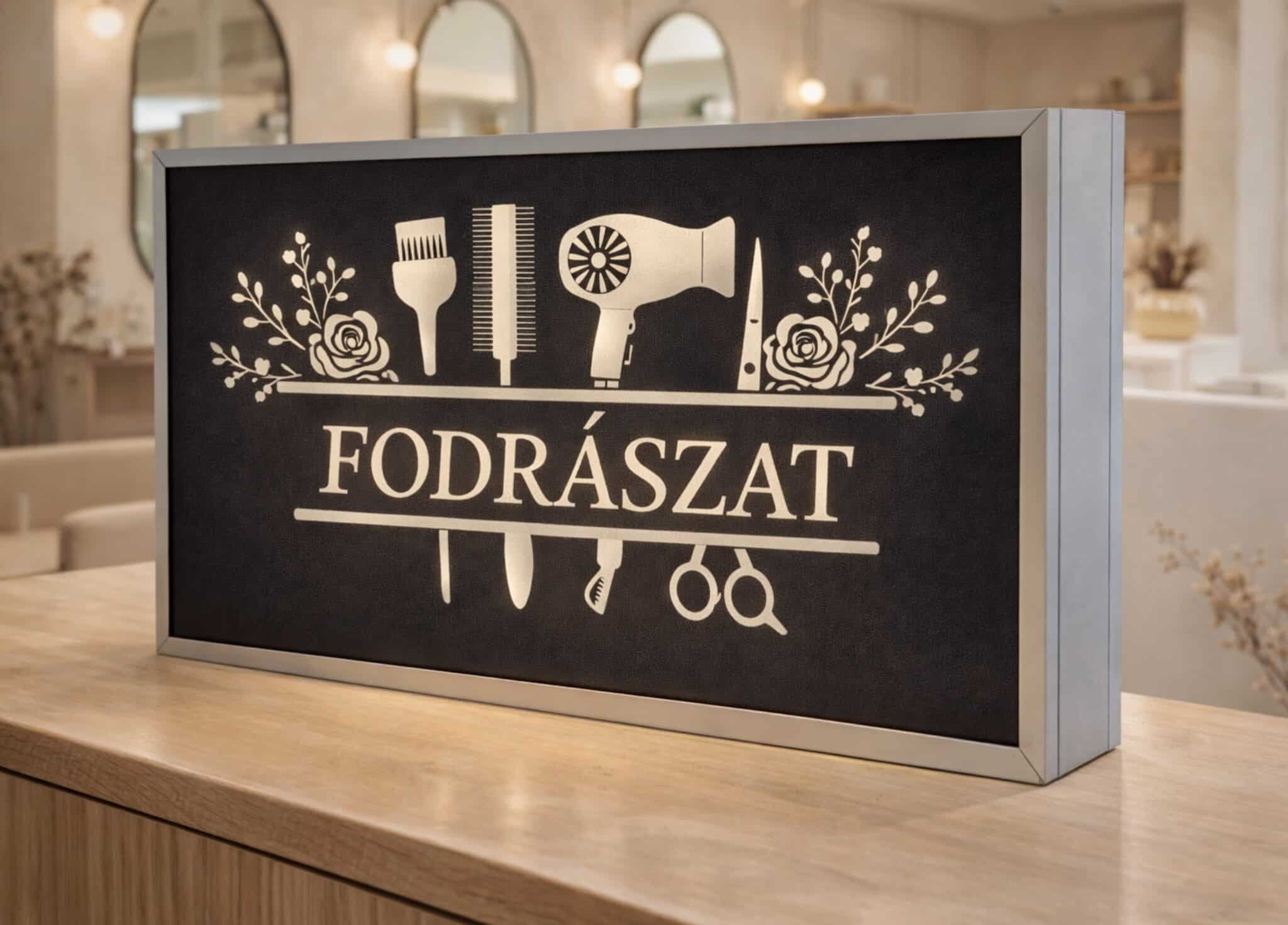 Világító fodrászat tábla – prémium LED cégtábla szalonoknak